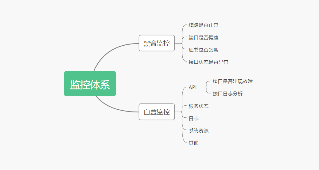 黑盒监控相较于白盒监控最大的不同在于黑盒监控是以故障为导向当故障发生时,黑盒监控能快速发现故障,所以我们监控时候以粒度比较细的,如端口、接口、线路等进行监控。