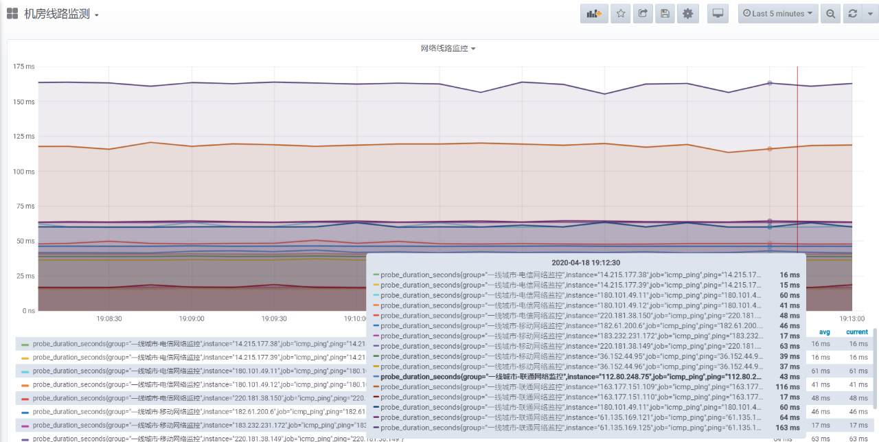 这个grafana是自己定义的,看到网上没有就自己定义了一个。大家可以从github上下载,再看看效果,可以看到我们通过Ping 就获取到了全国各地的线路运行情况,可以有效的检测到我们线路异常问题: