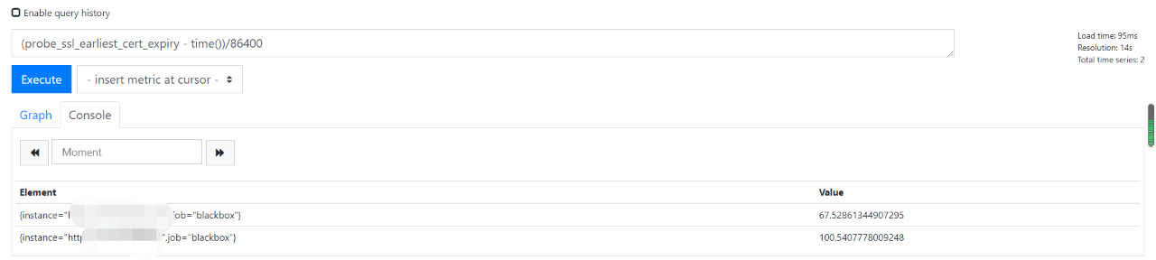 #经过单位转换我们可以得到一下,按天来计算:(probe_ssl_earliest_cert_expiry - time())/86400