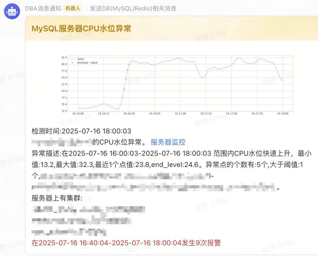 为避免同一消息发送很多次,从一个报警第一次发送开始计时,同一个消息在近n个小时只发送一次消息,剩下的报警在原消息的内容上更新,只显示最新的检测内容。另外一个集群的多个实例同时报警收敛为一个消息,一组集群同时报警收敛为一个消息,这样大大减少了报警数量,可以避免由于接收到大量的相同消息而把其它需要关注的消息忽略掉。