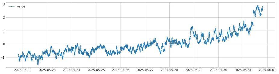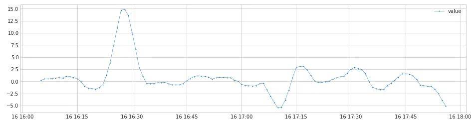 链路2同样先通过DoubleRollingAggregate(diff)算法进行数据转换,不同的是这次是计算的两个窗口中位数的差值,产生另一组新的时间序列,形成的曲线如下。然后再通过ThresholdAD(sign_check)算法检测异常点。