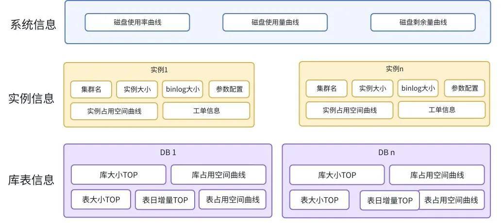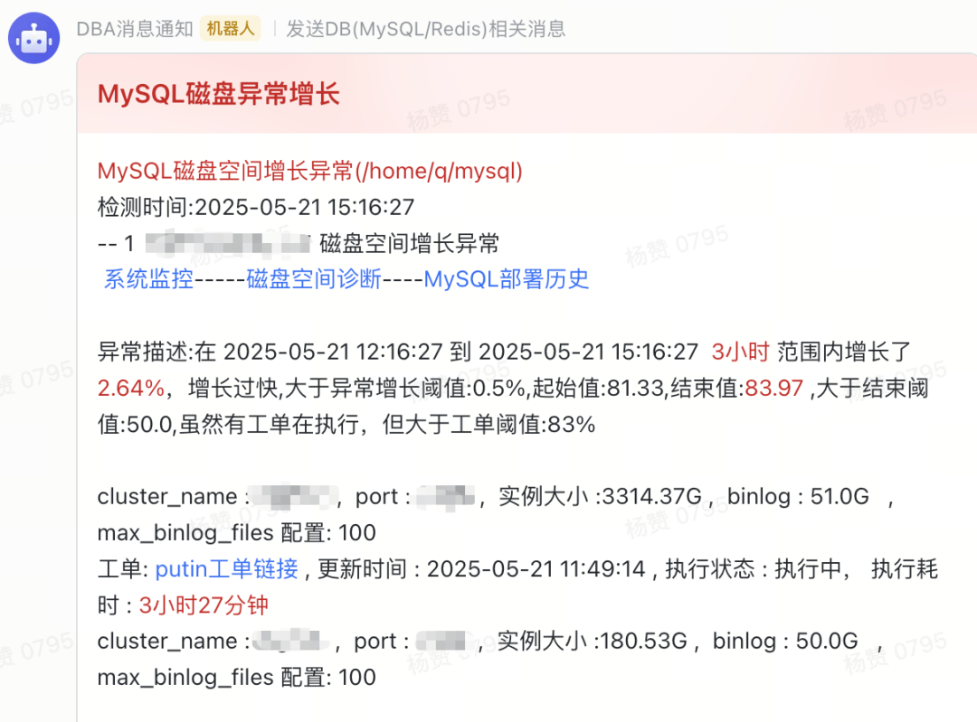 有些实例没有设置max_binlog_files参数,只设置了保留7天的binlog,在有归档任务时可能会产生几百G的binlog,导致磁盘异常上涨,这种场景会把这台服务器上的所有实例信息展示出来,包括参数配置,binlog大小等信息,方便快速定位问题。所以在磁盘使用量异常报警消息中增加了一个辅助报表协助DBA定位磁盘使用异常的原因。报表内容如下: