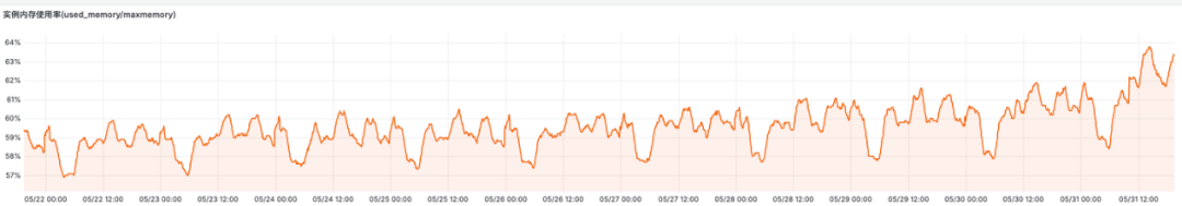 从监控图上可以看出该Redis实例的内存使用有两个明显特点: