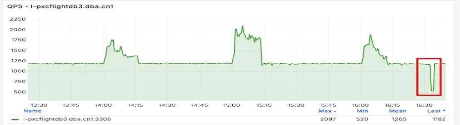 在大事务提交时,由于写binlog耗时长,将Binlog Events写入Binlog文件的过程必须要串行执行,只有一个事务写完了,另外一个事务才能执行,这时可能导致写操作掉0。低版本的MySQL是单线程复制,从节点应用大事务时,也会导致从节点QPS掉0,并伴有主从延迟。如下监控所示,在约16:30时刻QPS突然大幅度降低,然后又快速恢复。