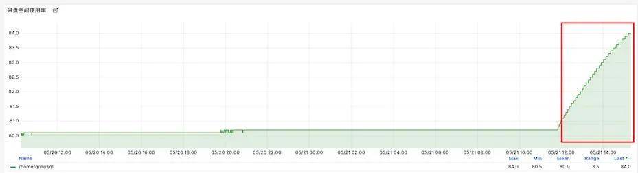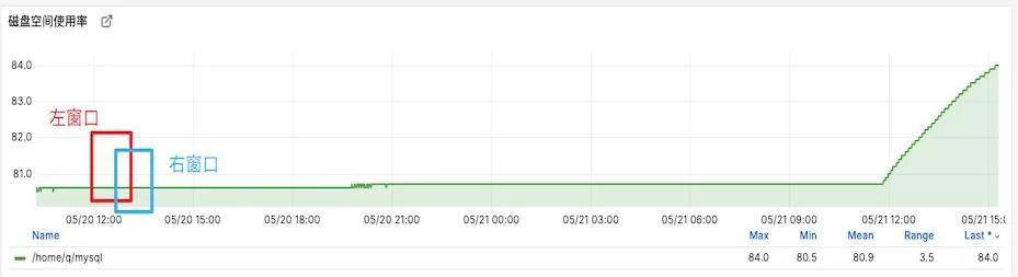 MySQL磁盘使用率一般都是均匀上涨的,如下面监控曲线展示,在红框标识的范围之前,使用率变化非常平稳,对于这种场景,如果使用率突然增加可视为异常,如红框范围内的数据: