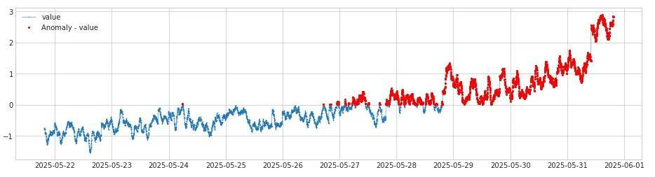 通过abs_residual转换的结果再通过iqr_ad(InterQuartileRangeAD)的四分位距法计算离群点,检测结果如下,其中红色为离群点(异常点):