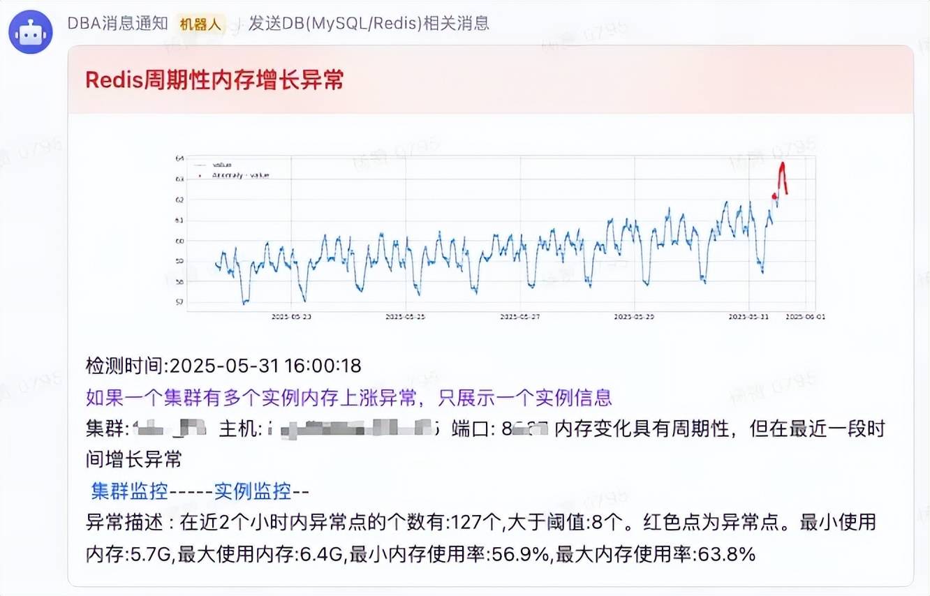在使用周期性变化异常检测时还需要有其他检测标准进行联合判断,否则可能会导致很多无效的异常信息,在满足下列其中一项条件的情况下,对于Redis内存使用量检测,即使周期性变化监测到有异常行为也被视为安全范围内的异常波动,不需要关注和进行消息提醒: