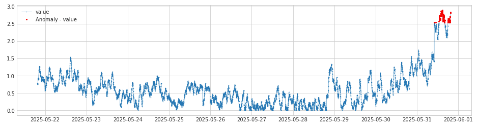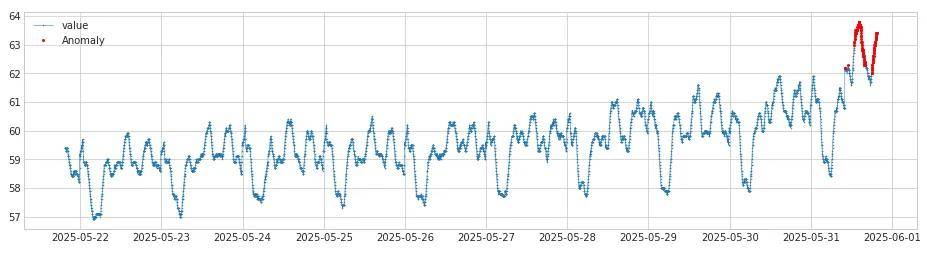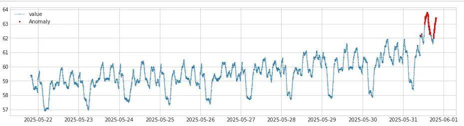 将diff_abs转化后的时间序列作为iqr_ads的输入,通过iqr计算出异常点,异常检测之后的图示结果如下,红色点是异常点: