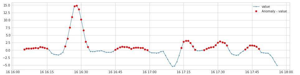 对于这种情况我们重点关注的是连续周期的变化趋势是不是一致的,最近的变化和之前的同周期变化有无较大差异,而对于单个周期内的增减变化不予以重点关注。通过周期性异常检测算法检测结果如下,红色的监控点是检测出来的异常点。可以看出最近一个周期的变化量明显高于前面的。
