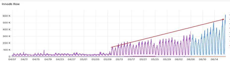 稳定性算法通过调整一些参数就可以检测到长期缓慢增涨的场景,例如下面监控图是MySQL扫描行数的监控图,由于业务新上线了一个sql,随着表数据量增加和执行频率增加,导致实例扫描行数长期缓慢上涨,,在造成严重的慢查询前需要检测出这种异常来。