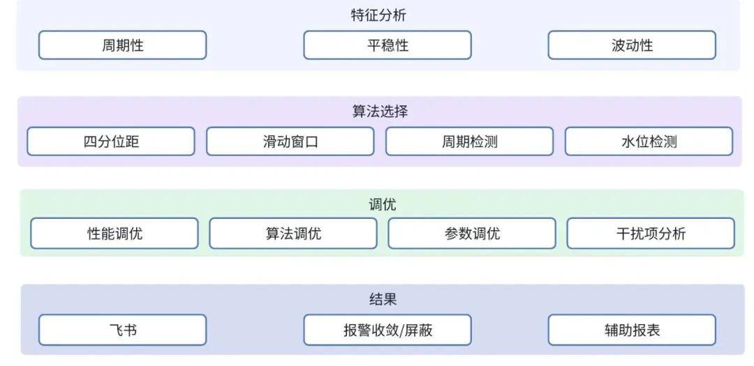 通过周期检测算法将有周期性规律的指标识别出来并且获得周期长度,检测出不符合周期规律的情况;通过水位检测识别出指标水位突然上升的情况等等。