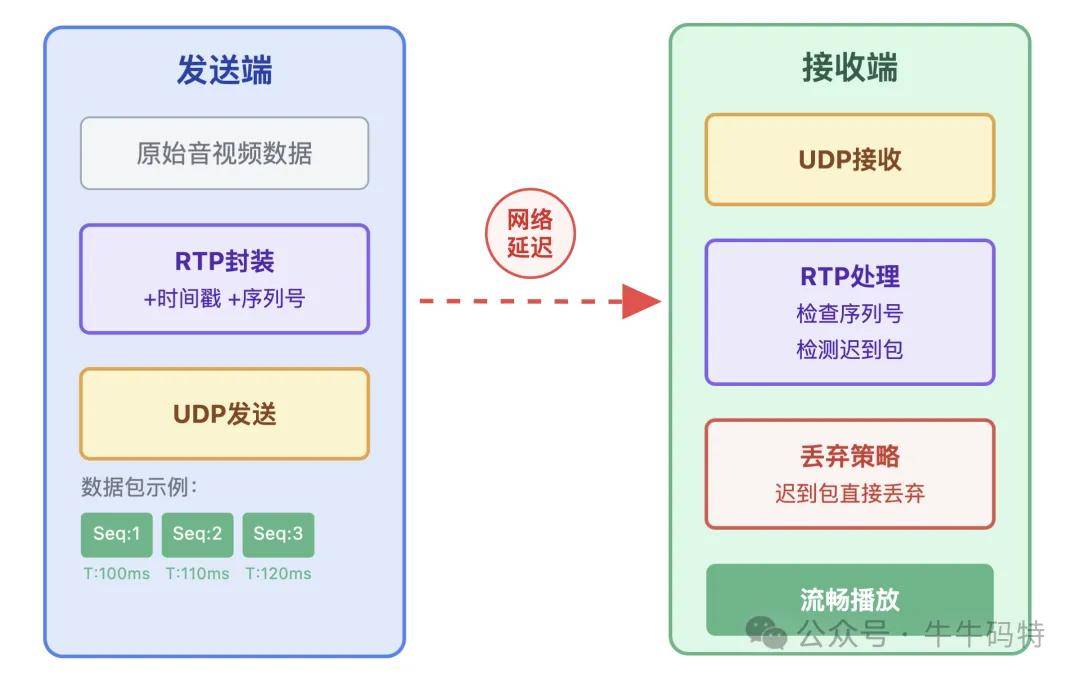那为什么不改用可靠性更强的 TCP 呢?核心原因在于音视频数据的 “时效性” :1 秒前的语音帧、3 秒前的画面帧,即便重传成功也早已错过播放窗口。如果让 TCP 执着于重传这些失效数据,不仅毫无意义,还会导致画面卡在旧帧无法更新;