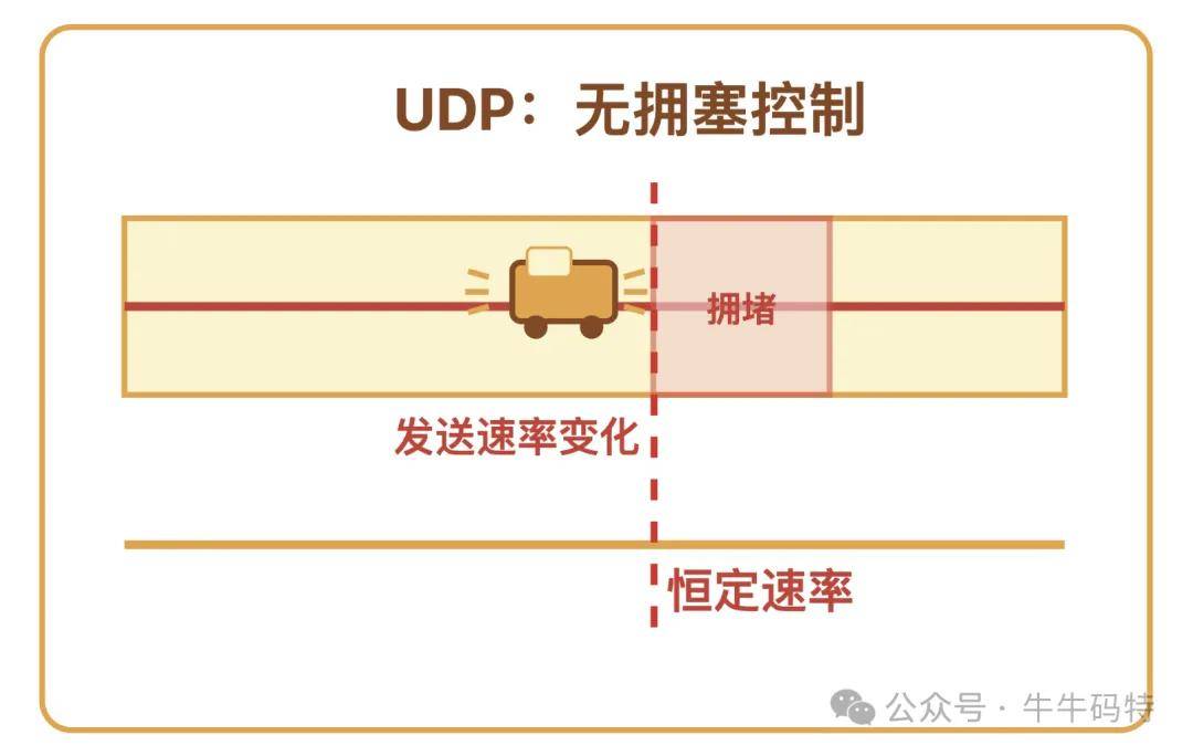 而 UDP 则是油门焊死的赛车手,不管前方是不是堵成了停车场,都始终以恒定速率往前冲。