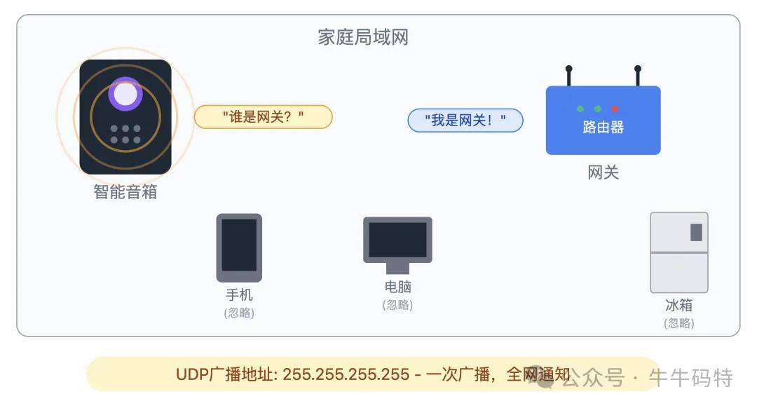家里的智能音箱连 WiFi 时,会通过 UDP 广播满屋子喊 “谁是网关?”,路由器听到后立刻回应 “我是网关!”,音箱很快就能完成配对;