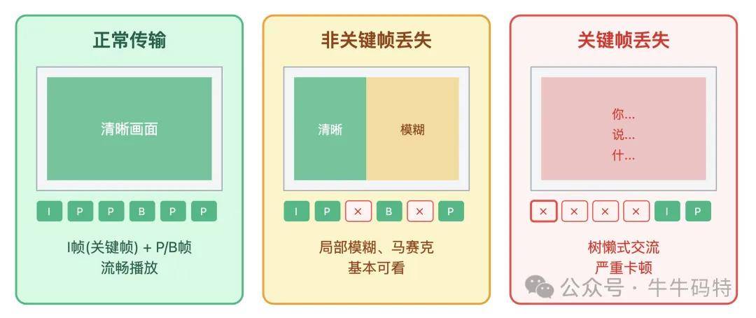 但快 ≠ 体验好:视频通话里那些让人抓狂的画面模糊、声音卡顿,罪魁祸首就来自于 UDP 丢包。如果是非关键帧丢失,画面可能会出现局部模糊、零星马赛克;而一旦关键帧 “失联”,或 UDP 大规模丢包,视频通话直接变成树懒式交流: