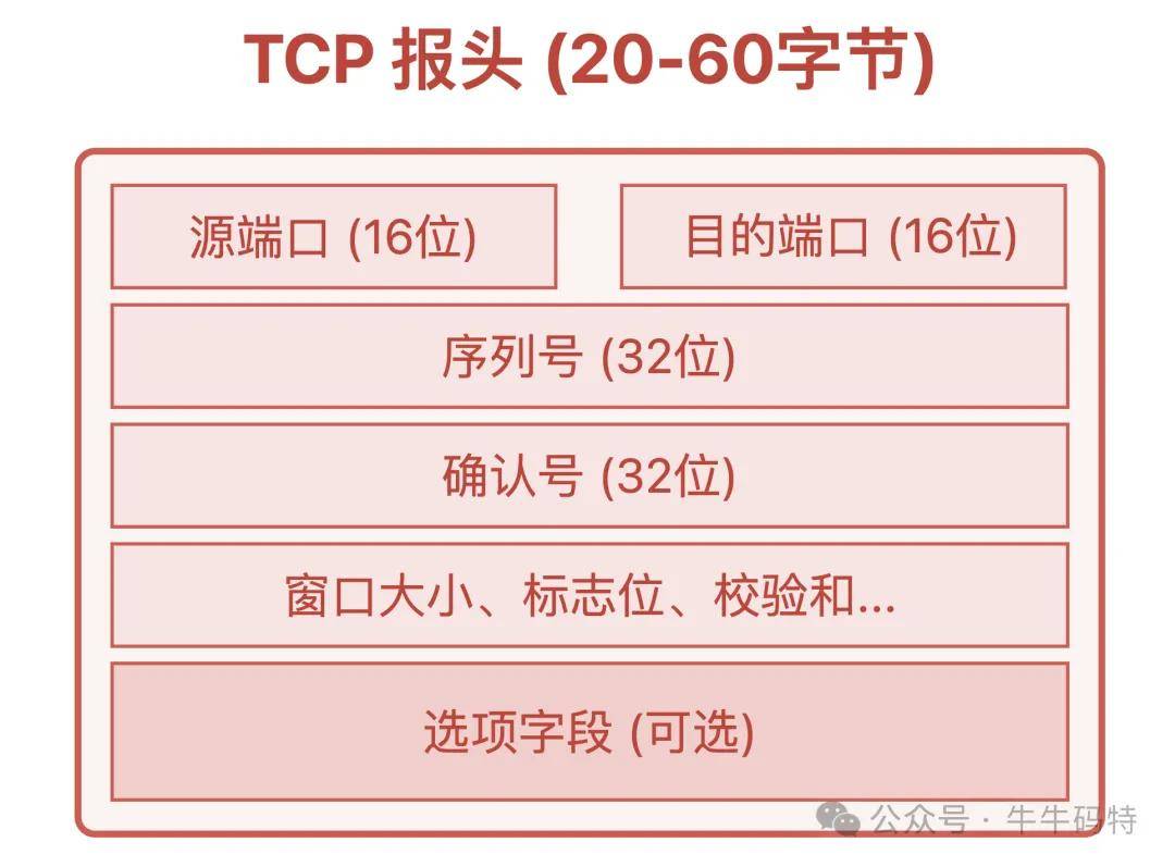 数据传输时,每个数据包都要带“身份标签” — 报头。TCP 的报头恨不得写满 A4 纸,大小在 20 到 60 字节之间,包含序列号、确认号、窗口大小等一堆信息。