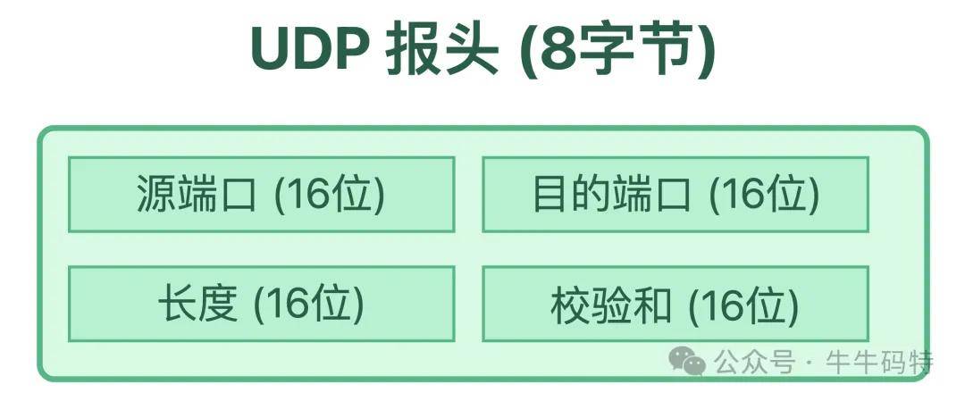 而UDP的报头只有 8 字节,只写四样东西:源端口(谁发的)、目的端口(发给谁)、长度(数据多大)、校验和(校验数据有没有写错)。