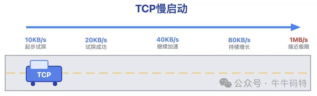 TCP 自带 “慢启动” 机制,就像新手开车,起步时慢慢试探 — 比如每秒只发 10KB 数据,先试探网络承载能力;等摸清网络能承受的速度上限后,再指数级提速,从 20KB/s → 40KB/s → 80KB/s,直至逼近网络极限速度如 1MB/s。