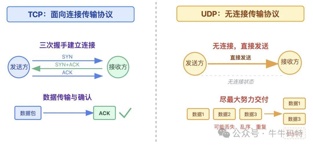 不可靠:UDP 不保证数据一定送到,可能丢包、乱序、重复。发完就忘了,丢了就丢了。