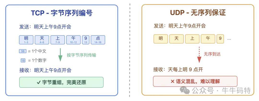 比如发送 “明天上午 9 点开会” 这条工作通知,TCP 会给每个字节都贴上专属序列号,从第一个字符到最后一个字符,挨个排队编号…… 接收方按序号重组,绝不会出现 “天每上明 9 点开” 这种让人摸不着头脑的乱序情况。