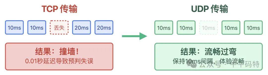 若采用 TCP 传输,一旦网络出现轻微丢包,它的拥塞控制机制就会立刻触发 “减速”,把数据发送间隔从 10ms 拉长到 20ms — 这看似不起眼的 0.01 秒延迟,却足以让玩家预判失误,直接撞墙!