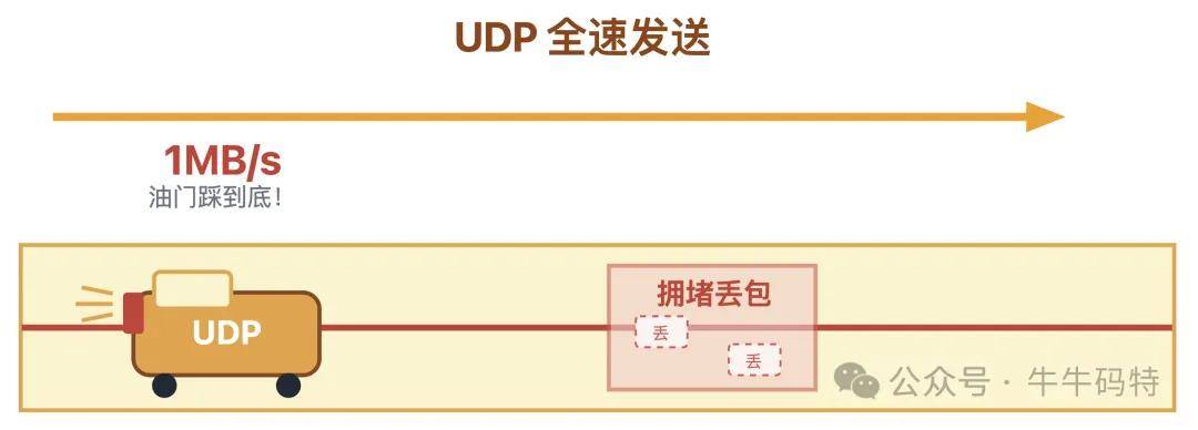 而 UDP 一上来就把油门踩到底,直接以极限速度比如 1MB/s 猛冲。