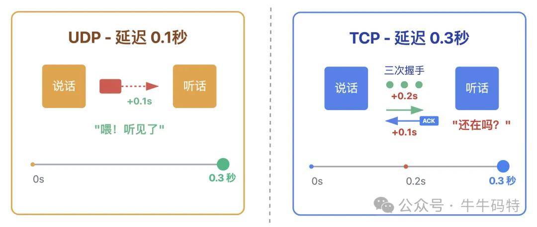 打视频电话时,你的 “喂” 字刚说出口,UDP 就直接把声音数据发出去,仅 0.1 秒对方就能听见;要是换成 TCP,通话开始前的三次握手就可能消耗 0.2 秒,再加上数据传输和确认,延迟可能变成 0.3 秒 — 这一来一回,对方都得催你 “还在吗?”。