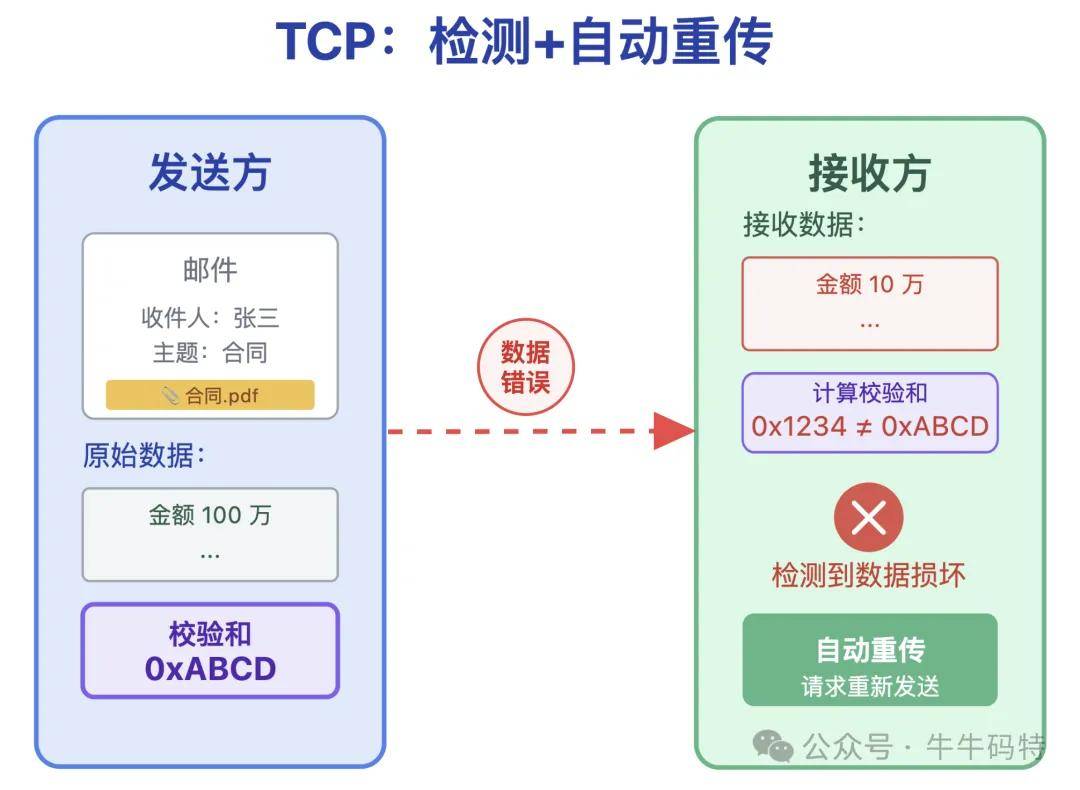 发送带合同附件的邮件时,TCP 会用 “校验和” 功能检查数据是否传错。一旦检测到数据错误,比如把 “金额 100 万” 篡改成 “金额 10 万”,它能立刻发现并重新传输。