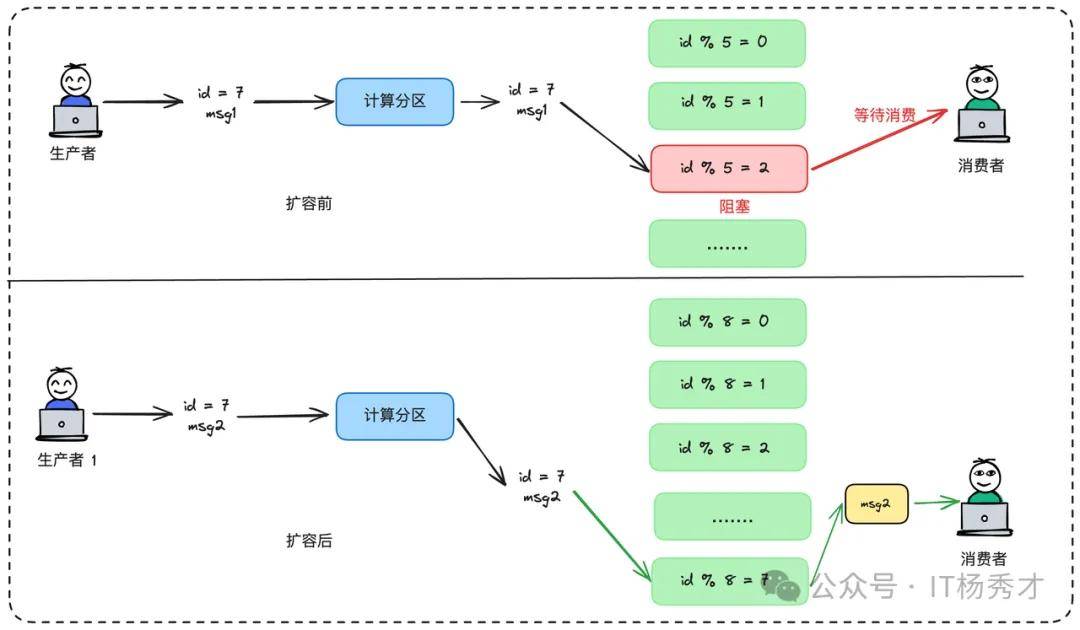 我们的分区策略是 partition = hash(orderId) % partitionCount。当partitionCount从5变为8时,对于同一个orderId,计算出的分区索引大概率会发生变化。