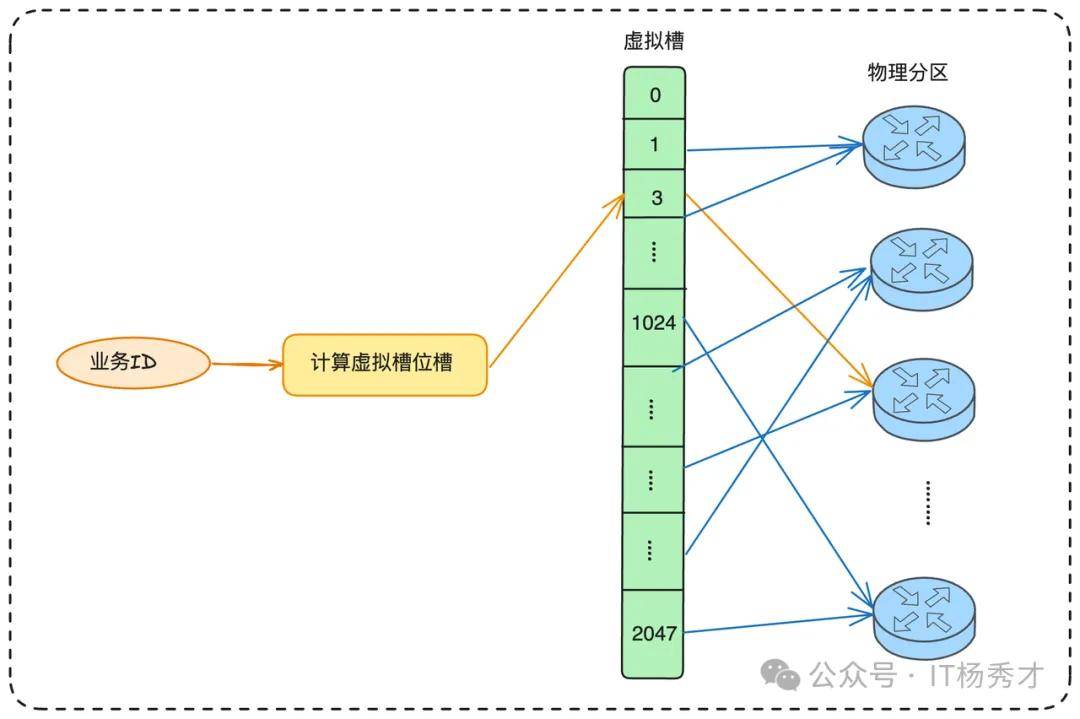 受启发于一致性hash环,其实是增大了取模分母。同样我们可以引入一个中间层——虚拟槽。不再将业务键直接映射到物理分区,而是先映射到一个固定数量的虚拟槽上(例如Redis的16384个,但是一般情况下我们业务不会用到这么多的槽位,比如在业务中可以简化为2048个,整个数量其实已经足够多了)。