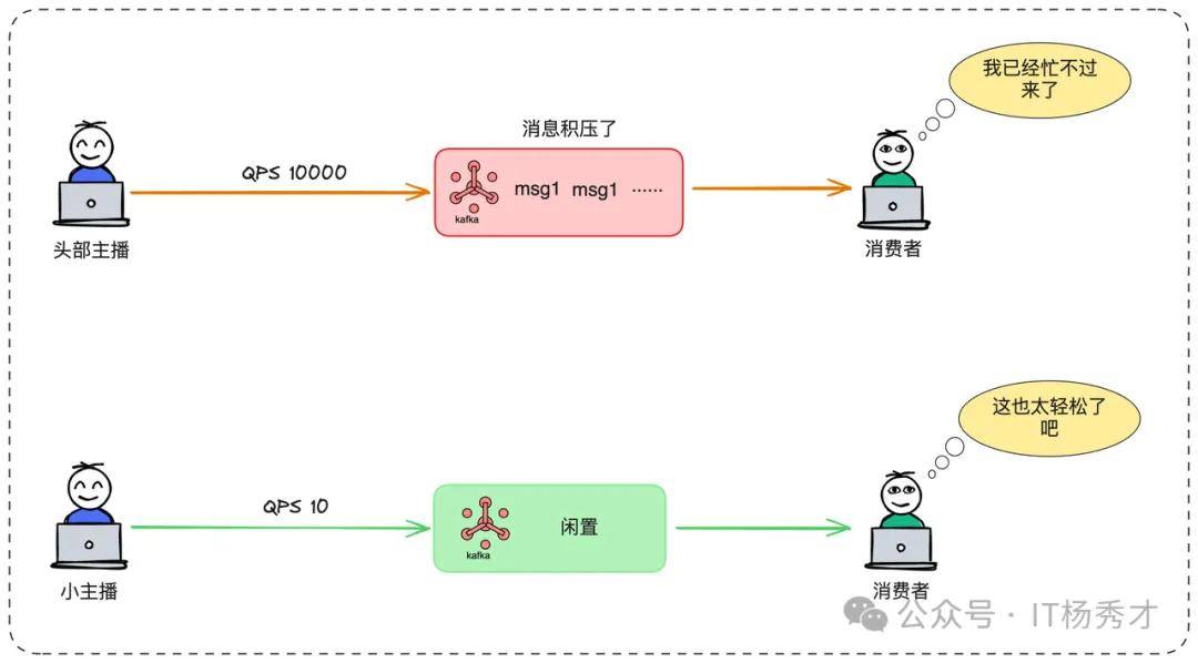 想象一个营销活动场景,某头部主播正在直播带货,几百万用户同时涌入,产生了大量的订单。如果我们的分区键是activityId,那么这场活动相关的所有消息都会涌入同一个分区,造成这个分区“热点”,消息严重积压;而其他分区则可能门可罗雀,资源闲置。