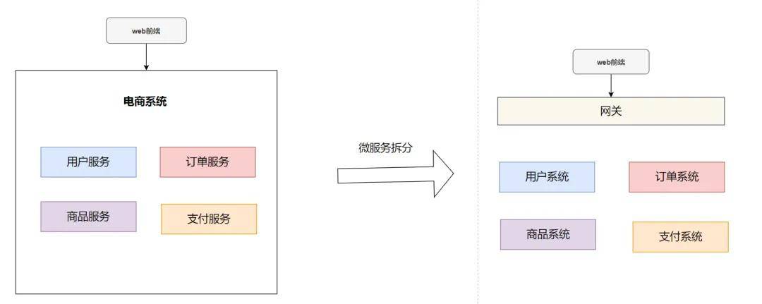 所谓的微服务拆分,其实就是把一个单体的应用,按功能单一性,拆分为多个服务模块。比如一个电商系统,拆分为用户系统、订单系统、商品系统等等。