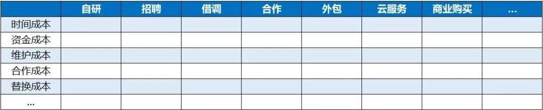 站在管理者视角上,就需要评估一段时间内的产出效率。完成一项工作,原来还有很多的手段可以选择。对于你来说,不同的方案意味着着多大程度的成本呢,可以尝试使用如下评估表。把你认为的“大”“中”“小”填入下表中。这个表格最大的意义不在于让你去评估每一种方案的成本大小,而在于扩展你的管理思路,看到解决问题手段的多样性,避免思路过于单一,就达到目的了。在不同的公司、不同的期待之下,不同的管理者会做出不同的选择。这不同的选择会带来不同的效果,同时也意味着不同的成本。