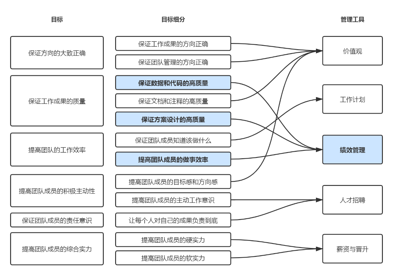 我把我所有的管理目的,和我所拥有的所有管理工具都列了出来,并划了线。按我自己的管理需要、以及管理权限,我使用绩效管理来达成的目的(如上图),只有这3个: