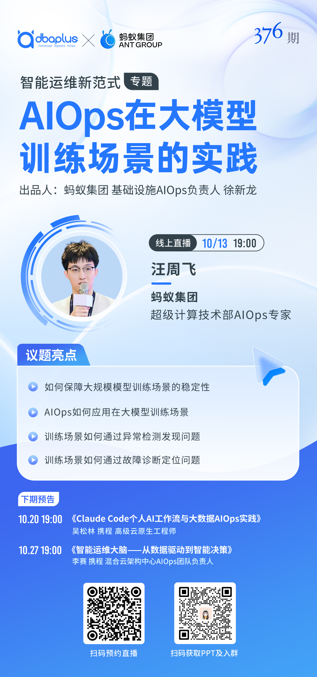 基于上述背景,dbaplus社群携手蚂蚁集团及携程多位智能运维专家,分别在10月13/20/27日周一19:00开展『智能运维新范式』专题直播,将聚焦大模型训练、大数据AIOps实践、运维大脑架构设计等智能运维领域的热门议题进行深度探讨。扫码可预约直播: