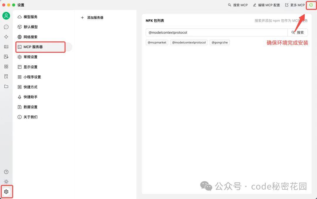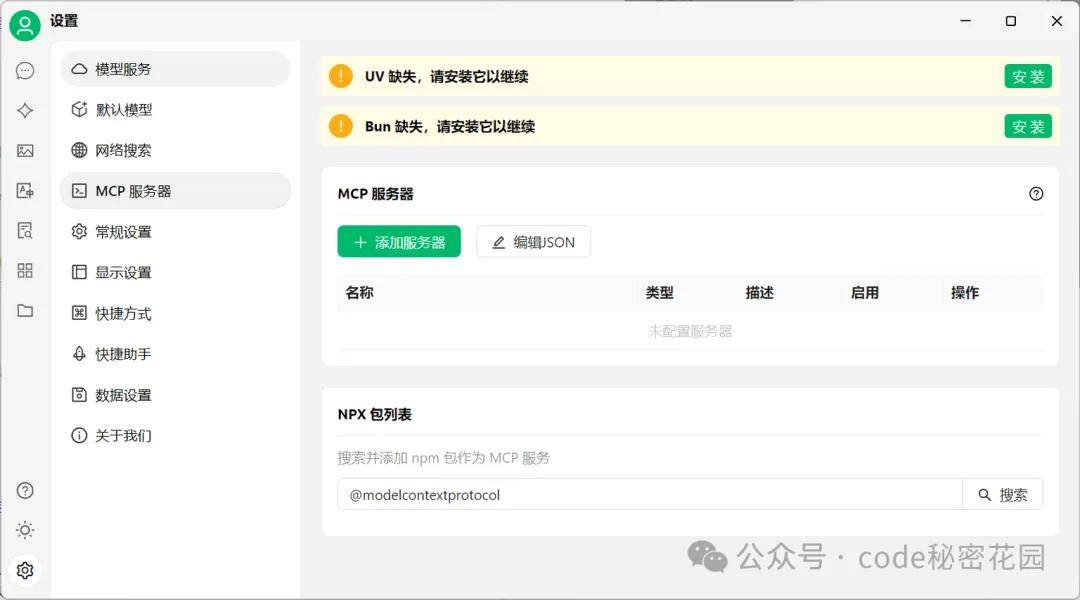 打开 Cherry Studio 客户端,我们到「设置 - MCP 服务器」把上面提示的两个环境完成安装: