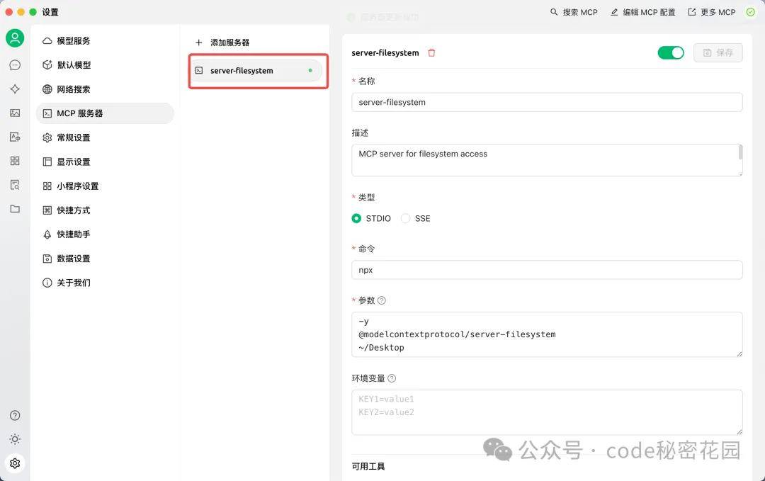 点击 + ,它会帮我们默认创建好一些 MCP Server 的配置,这里我们要补充一个参数,你允许让它访问的文件夹路径,比如 ~/Desktop: