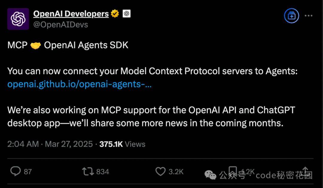 最开始推出的时候,只有 Claude 客户端支持,大家也没把它当回事,但是后续由于 Cursor(Cursor 和 Claude 的关系大家都懂) 的支持,各种插件和工具也开始陆续提供支持;再加上最近 AI Agent 被 Manus 这个 “概念” 工具给炒的非常火热,让 MCP 逐步开始走进大众视野,直到最近,Open AI 也宣布对 MCP 提供了支持:
