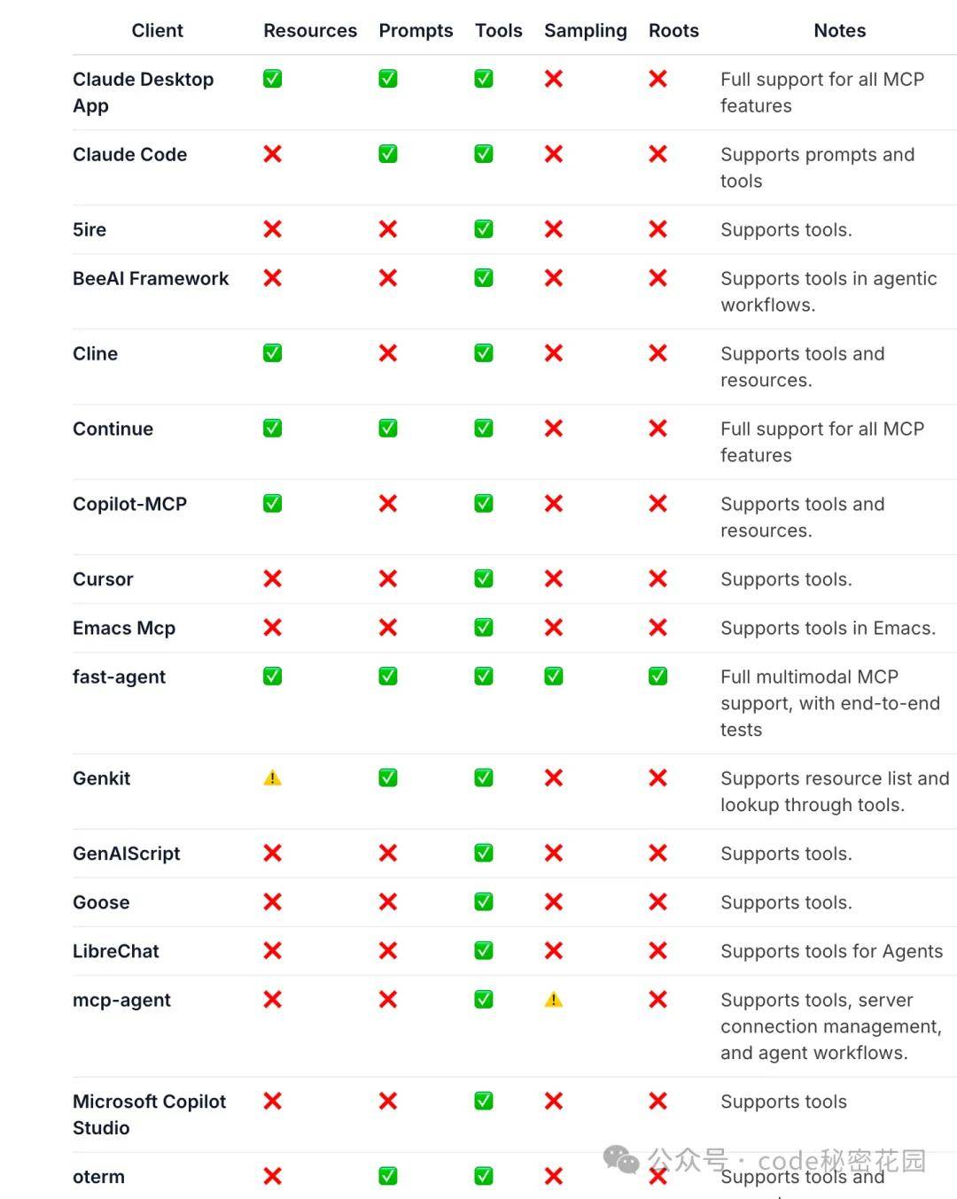 在 MCP 官方文档中,我们看到已经支持了 MCP 协议的一些客户端/工具列表: