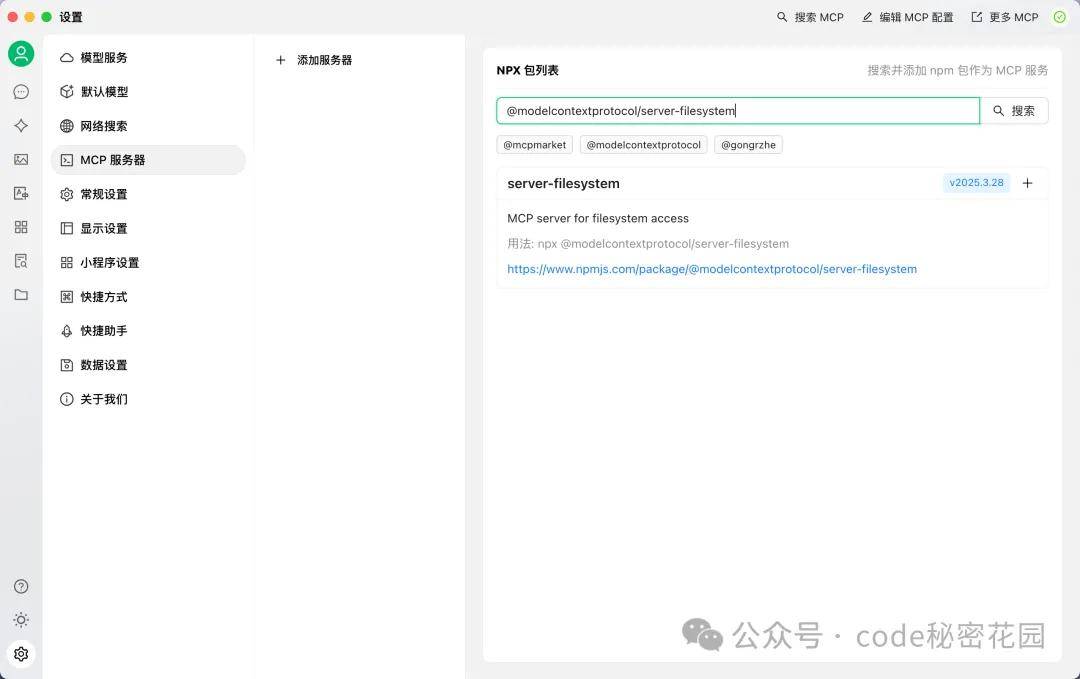 然后,我们在搜索框搜索 @modelcontextprotocol/server-filesystem,这里我们接入一个简单的文件系统 MCP: