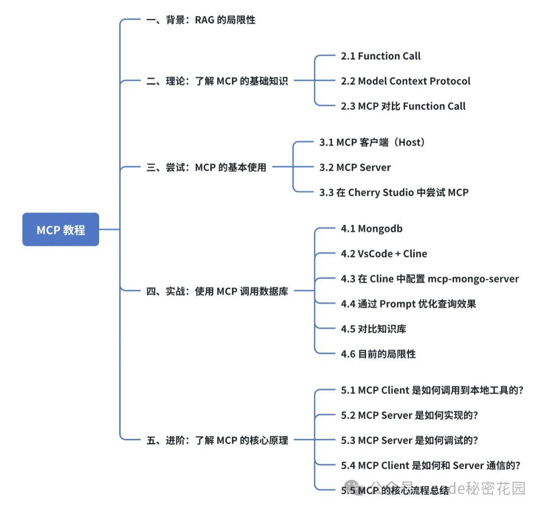 目前市面上讲 MCP 的教程比较多,但大多数都是一些概念性的讲解。最近我对 MCP 的体验也比较多,我也切实体验到了 MCP 确实是一项很有意义的技术标准,能帮助我们解决很多之前难以解决的问题。所以在今天的教程里,我从这样一个实际的案例出发来跟大家聊一聊 MCP,整体的学习路径如下:
