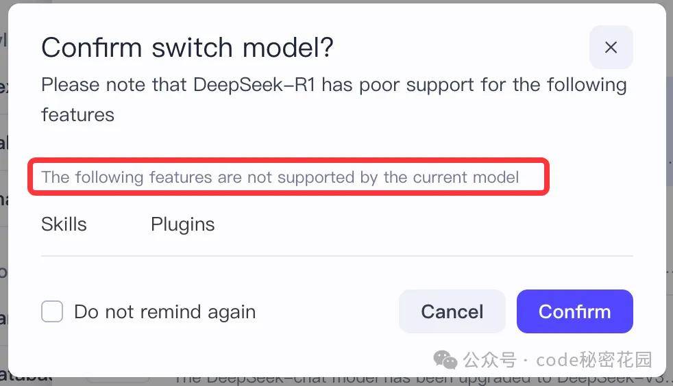 在 MCP 出现之前,开发者想实现 Function Call 的成本是比较高的,首先得需要模型本身能够稳定支持 Function Call 的调用,比如我们在 Coze 中选择某些模型时提示,选择的模型不支持插件的调用,其实就是不支持 Function Call 的调用: