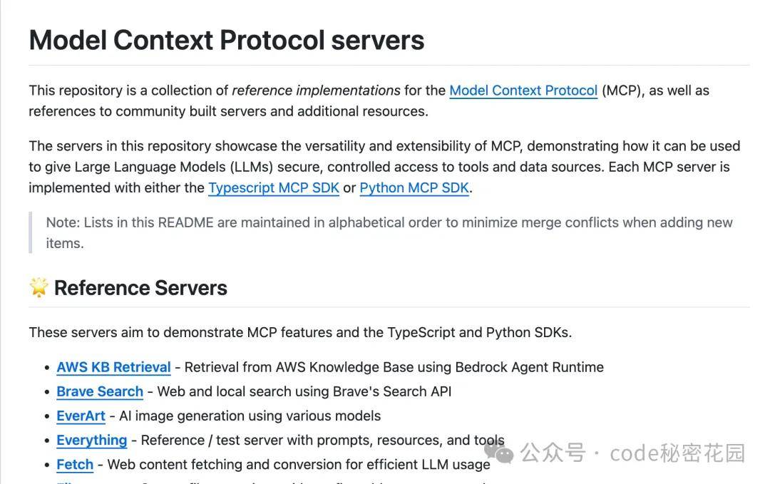第一个是官方的 MCP Server 集合 Github 仓库(https://github.com/modelcontextprotocol/servers),里面包含了作为官方参考示例的 MCP Server、被官方集成的 MCP Server 以及一些社区开发的第三方 MCP Server: