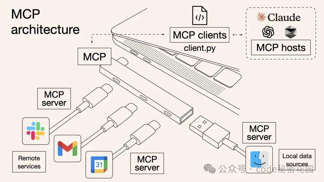 通过 Function Call ,每次要让模型连接新的数据源或使用新工具,开发者都得专门编写大量代码来进行对接,既麻烦又容易出错。而 MCP 的出现就是为了解决这些问题,它就像是一个 “通用插头” 或者 “USB 接口”,制定了统一的规范,不管是连接数据库、第三方 API,还是本地文件等各种外部资源,都可以通过这个 “通用接口” 来完成,让 AI 模型与外部工具或数据源之间的交互更加标准化、可复用。