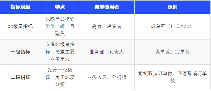 又称第一关键指标,是反映产品核心价值的唯一最重要指标。它应当能反映用户从产品中获得的核心价值,反映用户的活跃程度,直观可拆解,并能够为产品或业务的长期目标奠定基础。例如,打车类App的北极星指标是"成单率",支付宝早期的北极星指标是"两亿三次"(一年内达到2亿用户,用户平均使用次数超过三次)