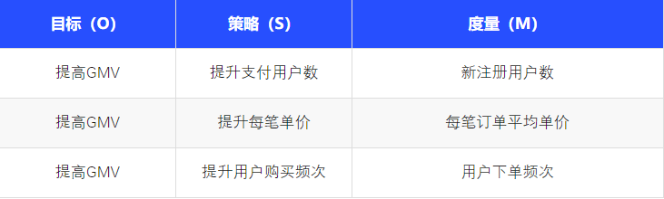 度量(Measurement) :指用于衡量策略执行效果的具体指标。这些指标应当可量化、可跟踪,如"新注册用户数"、"每笔订单平均单价"和"用户下单频次"等