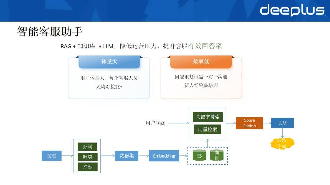 为解决上述痛点,货拉拉借鉴行业经验,开发了一款基于RAG+知识库+LLM搭建的智能客服助手。这款助手将聊天记录中的SOP文档进行分词打标处理,通过Embedding技术存入向量数据库。当用户提问时,系统仅需通过ES进行关键字搜索,接着利用向量数据库进行向量检索。通过Score Fusion做综合排分,重新排序后将问题输入到大模型进行总结并生成标准回答,客服人员只需要进行简单审核即可。