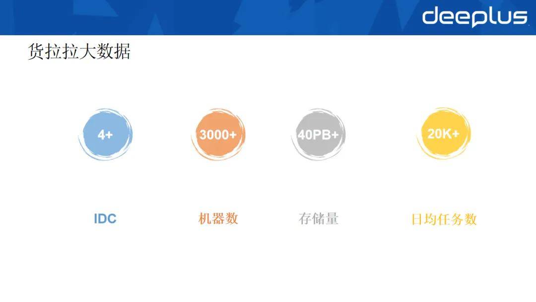 在大数据层面,货拉拉目前拥有4个DC,采用跨云混合云架构,涵盖阿里云、腾讯云以及部分自建机房。部署机器数量超过3000台,数据存储量40PB+,日均处理任务数20k+。当前,货拉拉的机器规模、数据存储量及日均任务数均处于业界中等水平,且在快速发展中。