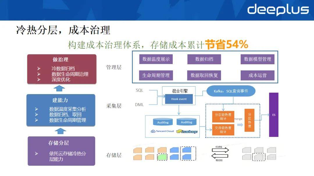 货拉拉构建了云数据管理平台作为成本治理体系,通过整体成本治理与存储优化,存储成本累计节省54%。其架构划分为三层: