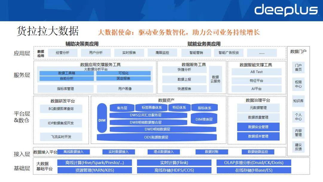 大数据的使命是驱动业务数智化,助力公司业务持续增长。以上是货拉拉的大数据架构体系,该体系自下而上相互支撑,以满足公司离线场景的需求。主要分为: